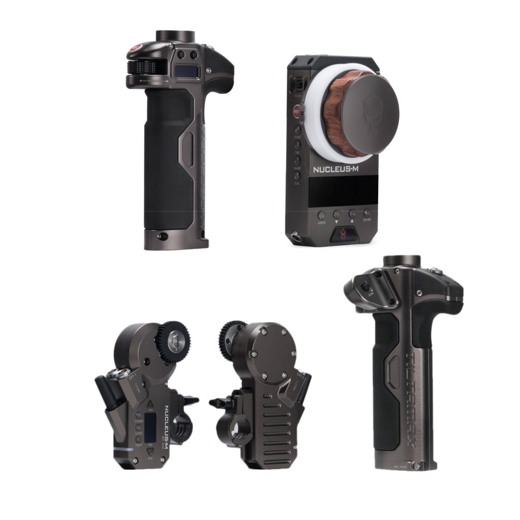 The Tilta Nucleus-M Wireless Lens Control` System features a 1000′ (300m) transmission range, and comes with two lens drive motors with built-in wireless receivers, a FIZ hand controller, and two handgrips—one to control focus, and the other iris and zoom. The lens drive motors each feature a cine standard 0.8 MOD drive gear and two 7-pin connectors, which enables you to freely swap or interchange each motor. The motors power by daisy-chaining using the 7-pin cables, and each motor includes a 19mm rod clamp with 19 to 15mm reducing bushing.