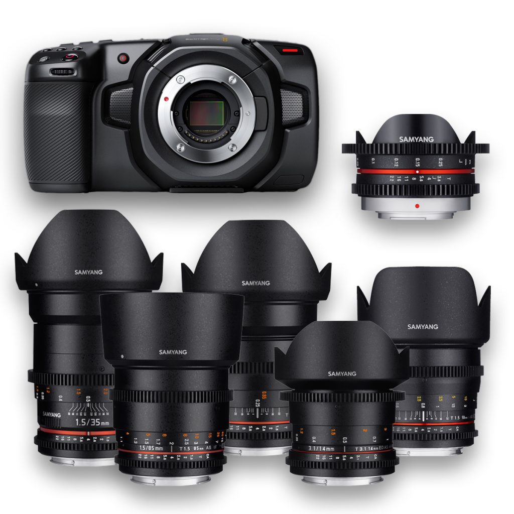 Digital Cinema Kit with Blackmagic Pocket Cinema 4K camera and 6 Samyang cine-prime lenses available for rental at Digital Azul.