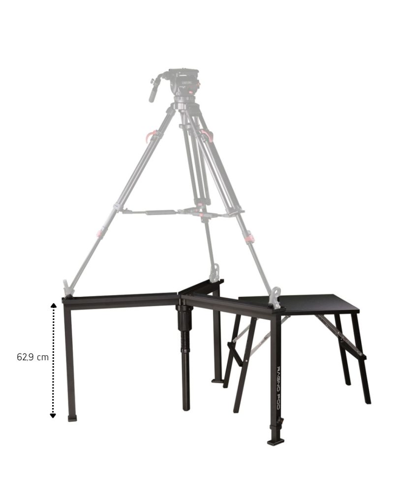 The Portable Tripod Riser is an elevating platform designed to raise professional video tripods by approximately 62,9 cm, allowing operators to gain camera height quickly, safely, and in a controlled manner. It is a practical solution for improving camera angles in environments with audiences, temporary structures, or congested technical areas.
